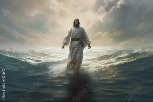 Jesus walking on the water. This artwork portrays the miraculous event from biblical narratives, conveying a sense of divine power, faith, and the transcendent nature of Jesus presence. Ai generated