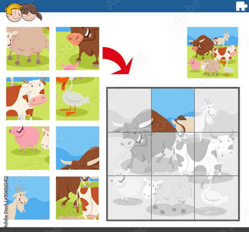 puzzle, jigsaw, education, cartoon, illustration, activity, animal, farm, farm animal, bull, cow, cattle, goat, pig, baby pig, sheep, duck, group, funny, preschool, design, children, vector, game, application, template, pastime, piece, square, drawing, character, solution, jigsaw puzzle, workbook, educational, design element, task, arrange, hobby, graphic