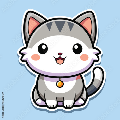 kitten, cat, happy, grey, sticker, cute, cartoon, animal, pet, adorable, playful, furry, felino, paw, whisker, tail, eye, nose, mouth, small, young, charming, sweet, innocent, lovely, friendly, cheerful, joyful, fun, mascot, graphic, illustration, design, image, vector, artwork, art, digital, children, children, baby, toddler, character