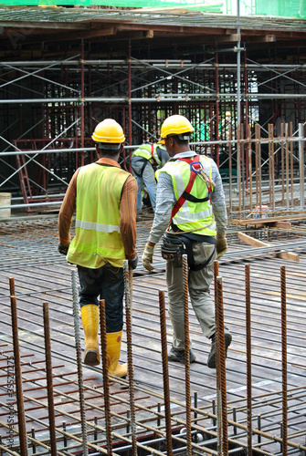 JOHOR, MALAYSIA -JUNE 17, 2016: Construction workers walking in the construction site. Wearing proper PPE for their safety.