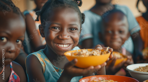 Joyful African children, their faces lit up with smiles, eating bowls of corn and rice during lunch at school.