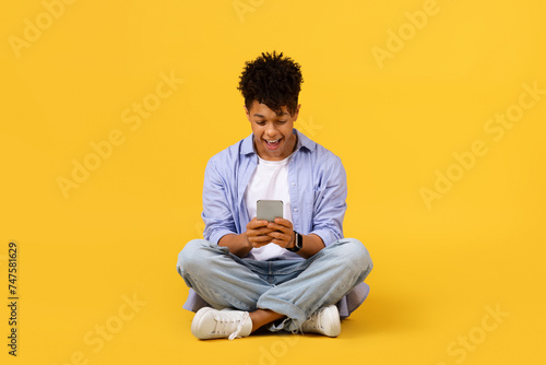 Joyful black guy using smartphone while sitting cross-legged on yellow background