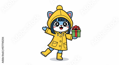 cartoon, cat, character, girl, animal, cute, happy, gift, present, raincoat, yellow, boot, festive, cheerful, adorable, illustration, design, stylised, whimsical, digital, art, gift box, holiday, celebration, expression, rain, weather, winter, spring, autumn, colourful, graphic, drawing, animation