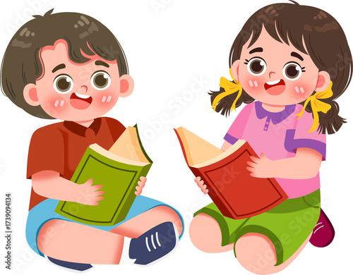 children, reading, book, cartoon, illustration, joyful, happy, learning, education, friendship, together, smiling, cute, cheerful, children, girl, boy, sitting, open book, colourful, bright, playful, story, literature, preschool, elementary school, childhood, leisure, activity, graphic, design, vector, art, drawing, character, fun, classroom, library, study, positive, teamwork