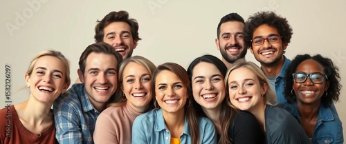 Joyful group portrait, lighthearted smiles against a neutral backdrop, close-up, happy