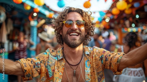 man, smile, festive, marketplace, summer, evening, celebration, colourful, shirt, decoration, light, happy, crowd, atmosphere, joyful, pattern, culture, nightlife, local, enjoyment, community, event, accessory, sunglasses, vibrant, greeting, fun, gathering, friends, laughter, art, happiness, interaction, energy, lifestyle, exploring, food, music, colours, tradition, collection, apparel, enthusiasm, casual attire, rural, street market