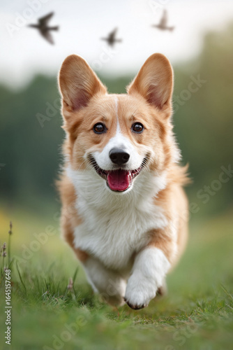 Joyful Welsh Corgi running outdoors in green grass, birds overhead. Symbolizing freedom, happiness, and playful energy. Perfect for pet product ads or cheerful content.