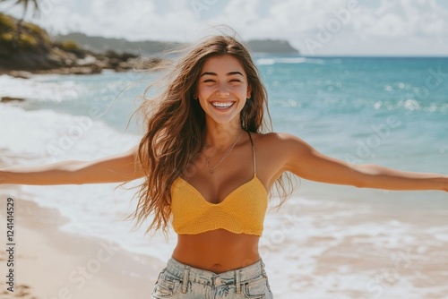 woman, beach, summer, happiness, ocean, sunlight, joy, carefree, beauty, nature, smile, relaxation, vacation, sand, wave, horizon, tropical, cheerful, lifestyle, outdoors, freedom, portrait, fashion, warm, sunny, playfulness, sea, water, hair, blue skies, vibrant, scenery, photo, joyfulness, landscape, youth, trendy, sun, seacoast, natural, serene, moment, fun, expression, enthusiasm
