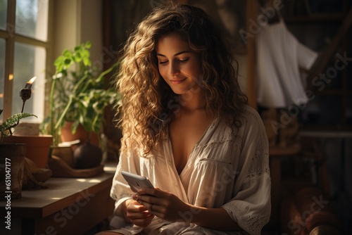 Joyful woman relaxing on her bed at home, smiling as she uses her smartphone, Generated with AI