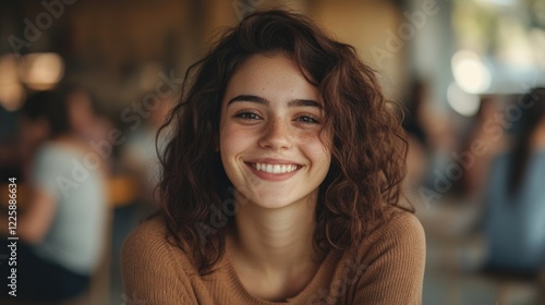 young, woman, joyful, smile, casual attire, clothing, curly, hair, indoor, setting, modern, background