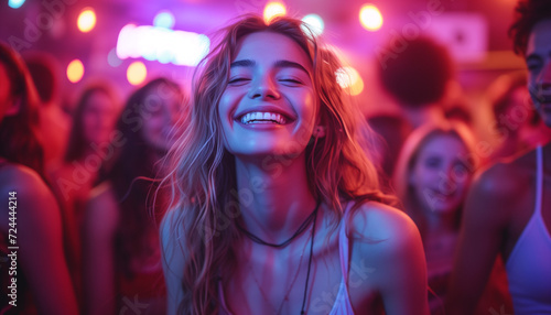 Joyful young woman smiling amidst a vibrant night party scene with confetti and balloons.