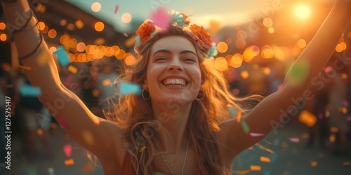 Joyful young woman with wavy hair, celebrating amidst colorful confetti and warm evening lights.