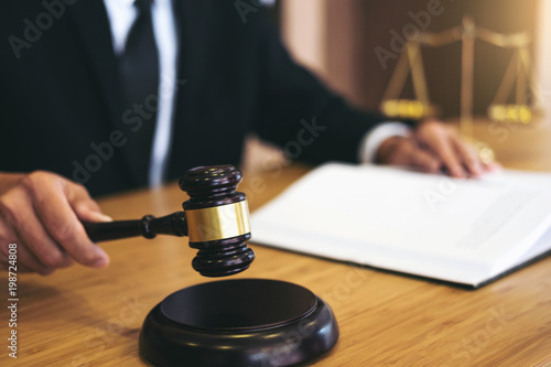 Judge gavel with Justice lawyers, Businessman in suit or lawyer working on a documents. Legal law, advice and justice concept