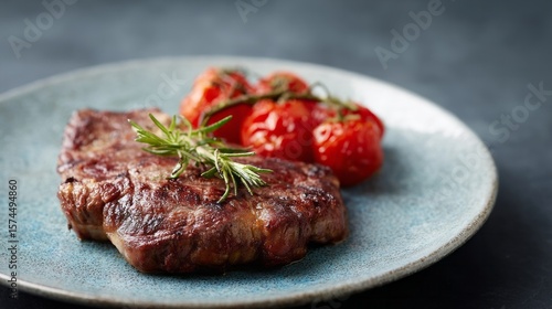 Juicy steak paired with charred tomatoes evokes rustic Tuscan cuisine, perfect for La Festa dei Ceri or Bistecca Night