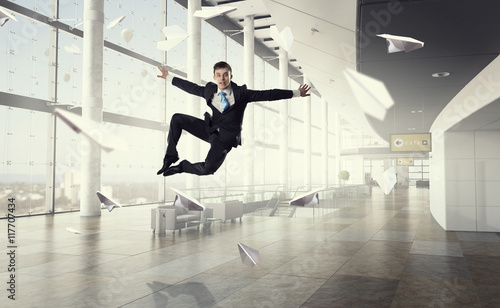 businessman, office, achieve, break, funny, happy, optimistic, interior, careless, mixed, media, male, man, rendering, jump, suit, victory, victorious, triumph, achievement, active, adult, attractive, building, business, contract, employee, excited, excitement, expression, fly, free, freedom, fun, happiness, joy, paper, room, secretary, sheet, success, successful, succeed, window, winner