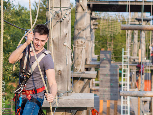 balance, rope, climb, recreation, adventure, sport, courage, fun, security, fuse, secured, skill, acrophobia, skill, activity, fear, danger, equipment, challenge, park, employment, danger, play, athletic, extreme, skilled, person, people, summer, active, outside, strength, high, height, action, happy, merry, man