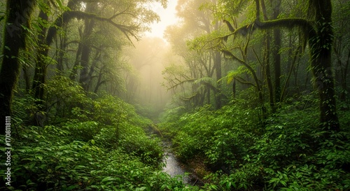 jungle, forest, path, sunlight, creek, foliage, tree, plant, green, nature, tropical, light, landscape, daylight, water, flora, vibrant, lush, rainforest, beam, stream, wood, bright, high-coloured, dense, isolated, copy space, photo, environmental, beauty, fresh, exotic, vegetation