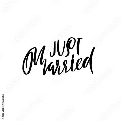 Just married. Dry brush lettering. Hand drawn calligraphy card. Modern typography poster. Vector illustration.