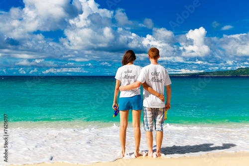 Just married young happy loving couple having fun on the tropica