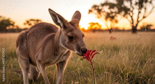 kangaroo, sunset, field, flower, grazing, wildlife, nature, animal, red, grass, landscape, australia, wild, free, peaceful, serene, evening, dawn, dusk