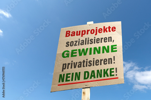 Kartonschild mit dem Slogan „Bauprojekte sozialisieren, Gewinne privatisieren! Nein Danke!“