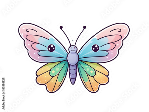 Kawaii Happy Butterfly Sticker with Pastel Wings on White Background