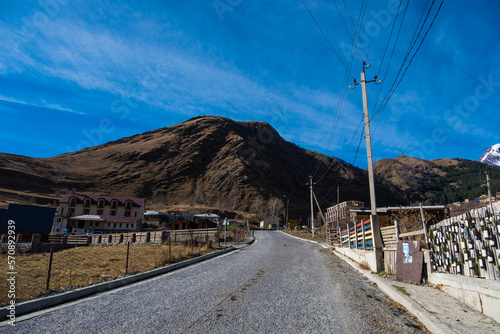 Kazbegi, Georgia : 10-11-2022 : Village Of Gergeti In Georgia, with the beautiful Caucasus mountain peaks and meadow surrounded