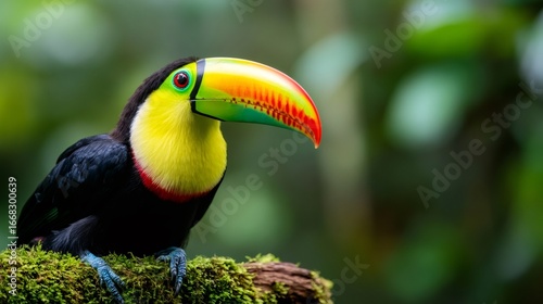 Keel-billed toucan perching on mossy branch in rainforest