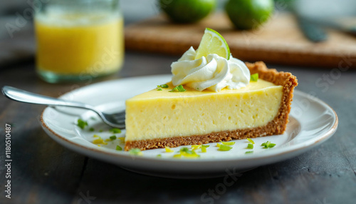 Key lime pie slice with whipped cream, lime wedge, and a fresh, zesty background.