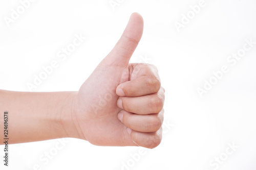Kid hand : Thumb up. Approval thumbs up like sign, caucasian child hand gesture isolated over white background