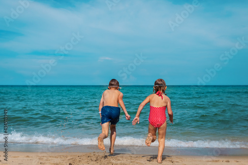 kids run to swim on tropical beach