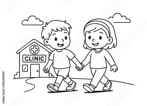 Kids Visit Clinic. Taking a friend to the doctor children?s coloring book illustration, outlined drawing, two friendly kids walking toward a simple cartoon