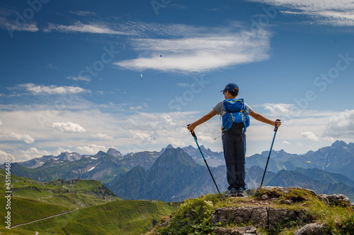 Kind mit Wanderstöcken vor Bergpanorama