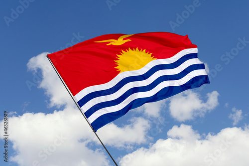 Kiribati flag isolated on the blue sky background. close up waving flag of Kiribati. flag symbols of Kiribati. Concept of Kiribati.