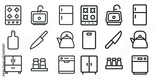 kitchen, appliance, utensil, icon, design, stove, sink, refrigerator, knife, kettle, cutting, board, dishwasher, cabinet, salt, pepper, minimalist, black, white, line, illustration, household, modern, graphic