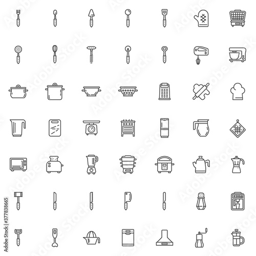 kitchen, appliance, kitchen utensile, icon, set, collection, pack, line, thin, outline, linear, vector, symbol, signs, web, illustration, element, logotype, pictogram, flat, pixel, honed, design, clip art, graphic, simple, hot drink, machine, food, processor, blender, microwave, oven, pan, refrigerator, stove, mixer, household, equipment, kettle, electric, dishwasher, electronic, scale, grinder, toaster, cooker, utensil, juicer, pot