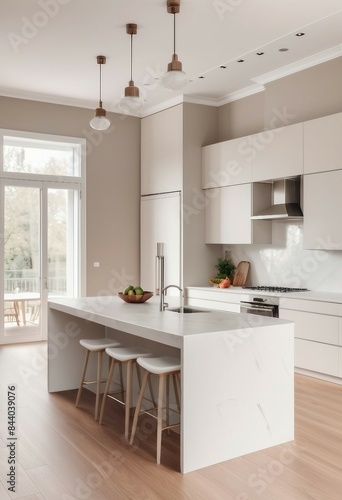 Kitchen interior in beautiful new luxury home with kitchen island and wooden floor,