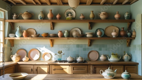 kitchen, interior, wood, cabinet, blue, wall, shelf, ceramic, pot, dish, countertop, sunshine, light, holding, to sit, bright, colours, tableware, vessel, display, arrangement, rustic, bungalow, style, decor, design, collection, earthenware, vintage, domestic, still, life, indoor, home, furnishing, tabletop, surface, sunlight, presentation