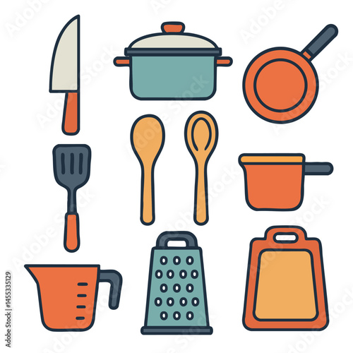 kitchen, utensil, cookware, tool, knife, pot, pan, spatula, spoon, grater, measuring, cup, cutting, board, orange, teal, modern, flat, design, cooking, food, preparation, kitchen utensile, home, domestic, culinary, equipment, household, illustration, graphic, art, simple, colourful, functional, practical, chef, bake, serve, meal, receipe, accessory, item, supply, essential, collection, decor, style