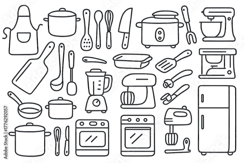 kitchen, utensil, doodle, cooking, hand, drawn, illustration, pot, pan, knife, cutting, board, spoon, can, hand-drawn