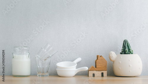 home, decor, decoration, minimal, kitchen utensile, utensil, glasses, jar, milk, ceramic, porcelain, white, light, wood, shelf, counter, table, wall, copy space, house, interior, blank, tool, brown, indoor, household, concept, empty, template, room, equipment, set, object, design, cactus, plant, vase, banner, blue, wide, breakfast, morning