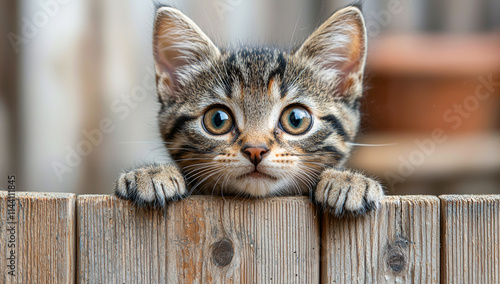 Kitten playfully exploring. Curious kitten peeking over a wooden fence in a sunny outdoor setting