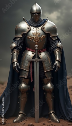 Knight clad in shining armor stands resolute against a stormy backdrop