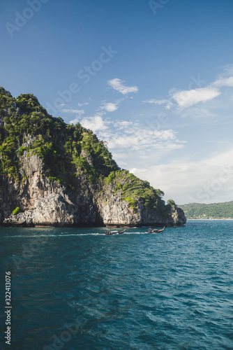 rock, siam, phi, boat, nobody, vacation, travel, sky, cloud, blue skies, coast, island, sunshine, sunlight, water, outdoors, day, travel destination, landmark, copy space, rock formation, sea, nature, famous, indian ocean, vessel, landscape, ocean, asia