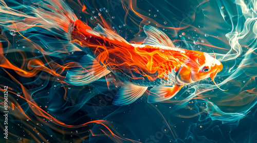 Koi fish swimming in abstract smoke and fire design