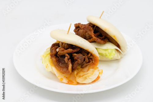Korean Style Spicy Pork Buns on a White Plate