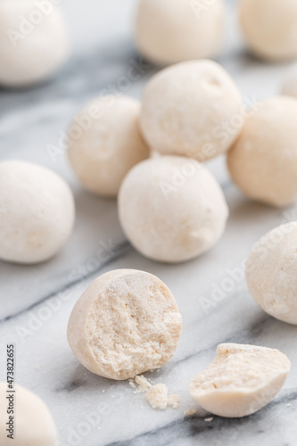 Kurut (kurt) cheese - traditional Asian cheese made from sheep's, goat's or cow's milk. Kazakh and Kyrgyz national food. white salty balls from dry cheese close-up on marble background