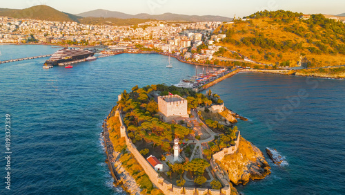 Kusadasi, Turkey. Aerial view of the scenic Pigeon Island connected by causeway to the Kusadasi coastline. Summer evening shot of the fortress and park. Aerial View