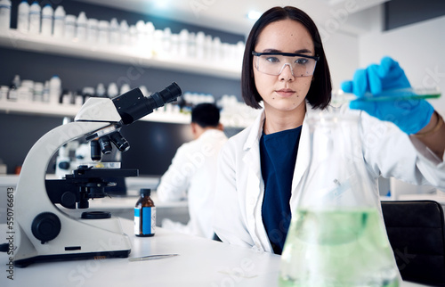 Lab, medical science and asian woman with beaker for chemistry experiment, research innovation and engineering scientist. Scientist, biology analysis and expert working with chemicals in laboratory