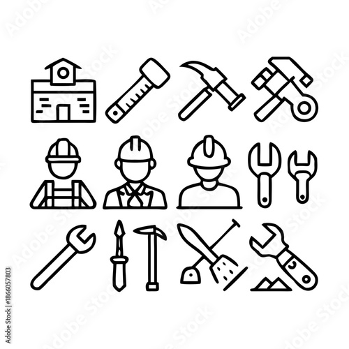 Labor Web Icon Set in Line Style. Collection of Construction Linear Icons, Including labour day, renovation, repair, work tools, materials, workers, building, business and more. Editable Stroke